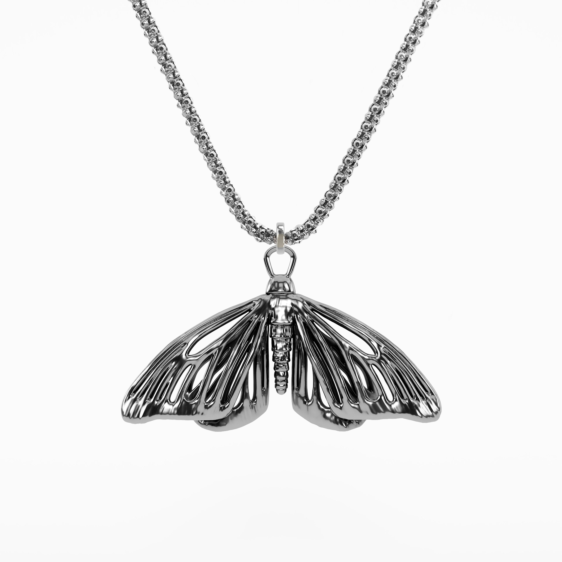 Ciondolo a forma di falena, realizzato in Argento 925, disegnato e prodotto in Italia; gioiello unisex pensato per uomo e per donna.
